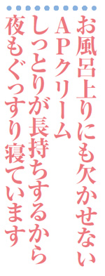 「ベタつかないから本人も嫌がらないし、しっとりが長持ちするし、保存料が入っていないのもいいですよね」。実はこのAPクリーム、ママ友達にも大好評なのだそうです。