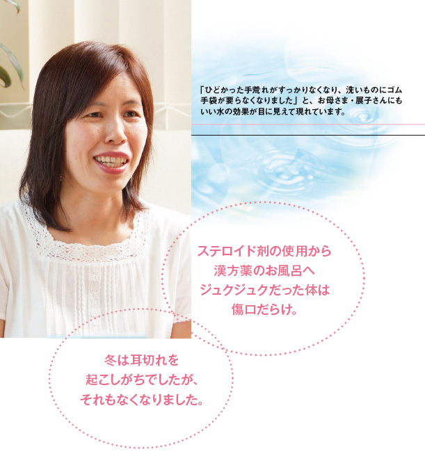さて、お風呂の水質の違いがはじめは実感できなかったとおっしゃった展子さんですが、 「お正月、おじいちゃんおばあちゃんの家に何泊かするのですが、帰る頃になると祐二は カサカサになっていました。自宅に戻ってお風呂に入ると治まってくるんですよ。 やはり違うのがわかりました」。