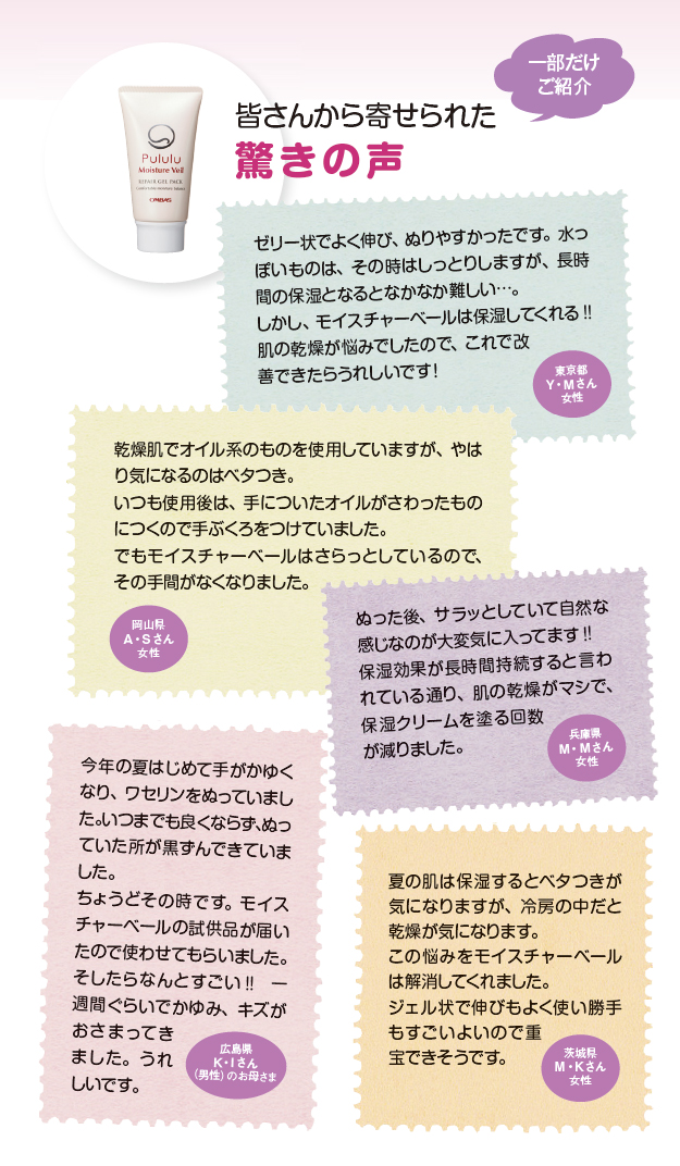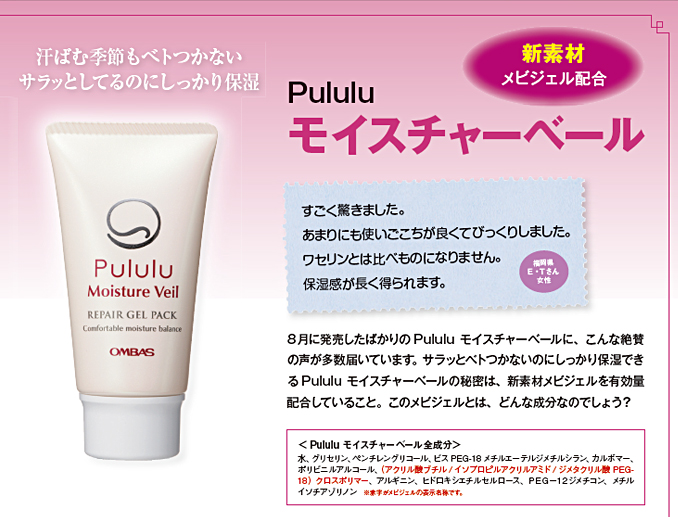 - ぬるときは液状だからサラッとベトつかず、ぬった後に肌の体温で急速に固まって肌の保湿効果・バリア機能を高めるPuluモイスチャーベールの秘密は、このメビジェルの画期的な性質にあったのです。