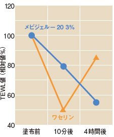 グラフはメビジェルとワセリンを肌にぬって、肌の経表皮水分喪失量(TEWL)を調べたものです。TEWL 値とは、肌から失われる水分量を示す値。この値が大きいほど水分は失われ肌は乾燥し、値が小さいほど水分は保たれ、保湿効果が高いということになります。