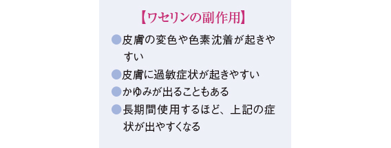 ただこのワセリン、保護効果は高いものの肌へのべトつき感に不満をお持ちの方も多いでしょう。さらに気をつけたいのは、長期間使用による副作用です。